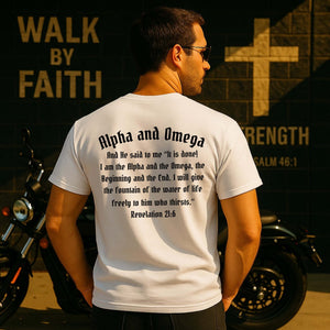 This Alpha And Omega Mens T-shirt with Bible verse on the back is sure to stand out in a crowd.  Wearing Men's Christian t-shirts with faith-based messages is bold way to share your faith and God's word with anyone.  This stylish t-shirt is soft, sturdy and versatile for all your daily activities.  Wear it to the gym, a backyard barbecue or working in the yard.  It's perfect for a variety of styles from streetwear to a classic casual look.