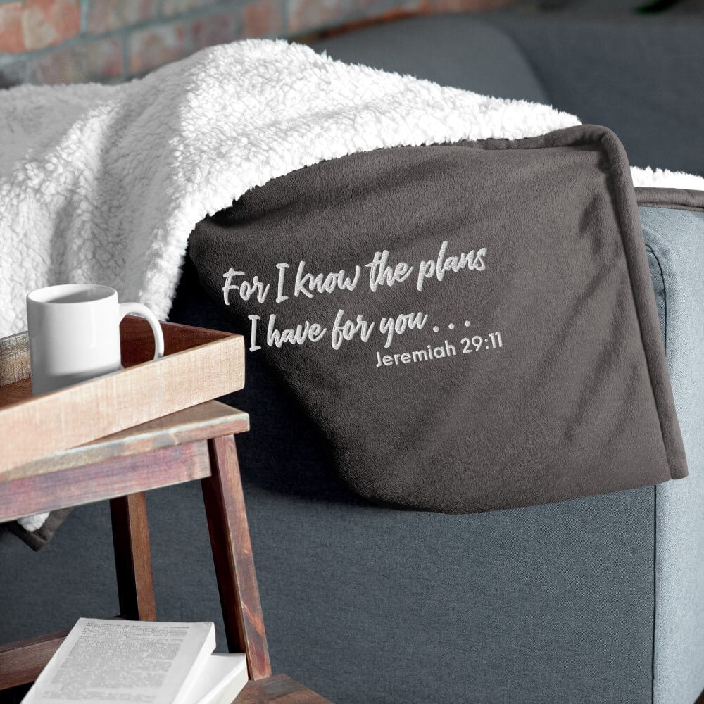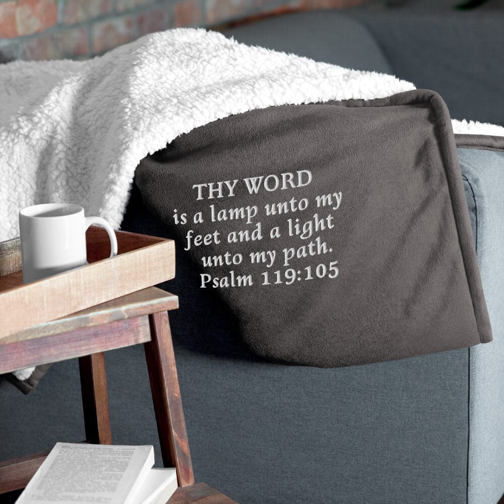 Cozy Christian Blankets with Bible verses make a special gift for Christian men and women. Whether you’re looking for your new favorite throw blanket or for a unique Christian gift for Christmas, birthday or Mother’s Day, premium sherpa plush blankets embroidered with encouraging faith quotes and Bible verses are the perfect choice. Comfort yourself inside and out when you curl up in a luxurious embroidered Scripture blanket fleece on one side and soft sherpa fabric on the other. Christian throw blankets are a great home decor to accent any room and style.