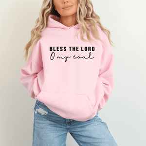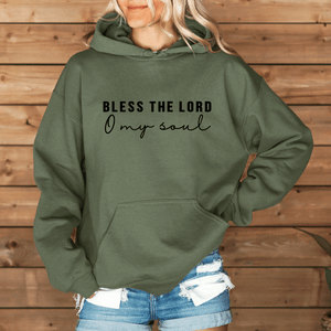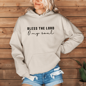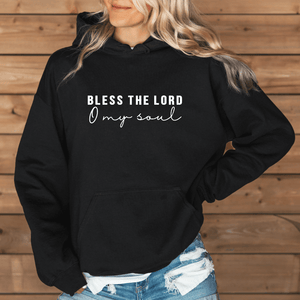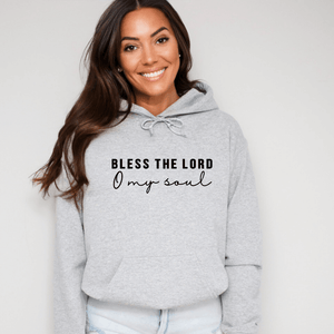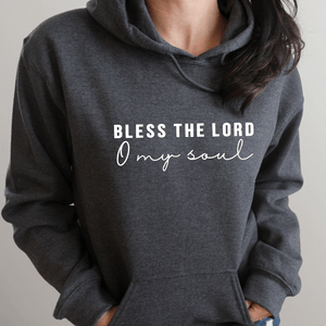Bless The Lord Hoodie.  This cool Christian sweatshirt with a faith-based message and sleek design is the perfect choice for cooler temps, comfort, and a casual style.  It's a cozy go-to Christian hoodie to curl up in, and a reminder to bless the Lord in all you do.  Inspired by Bible verses from Psalm 103, this Bless the Lord hoodie is a bold way to share your faith with anyone.