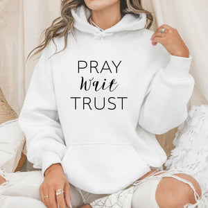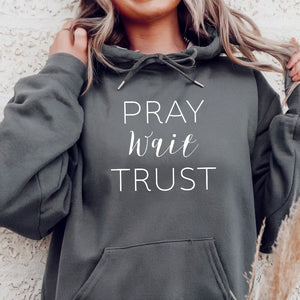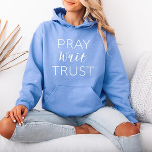 This Pray Wait Trust hoodie is the perfect combination of comfort and Christian casual style!1 With an encouraging faith-based message - pray, wait, trust, it will keep you cozy, warm, and confident in God's will.   Everyone deserves a cozy go-to Christian hoodie to curl up in, so go for one that's soft, smooth, and stylish. It's the perfect choice for cooler evenings in the spring, summer, and fall.  Best of all, it's a great reminder to anyone you meet to pray, wait, trust - God has a plan.