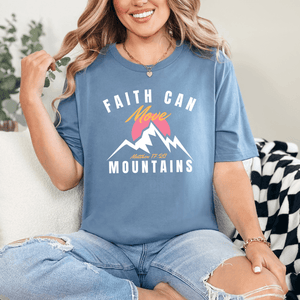 This Faith Can Move Mountains shirt is the Christian graphic tee you have been looking for! It's soft, stylish, and shares an encouraging faith-based message from Bible verse Matthew 17:20.  Pair it with denim shorts for a casual summer style, or go for a laid-back Christian street-wear style with joggers and sneakers.