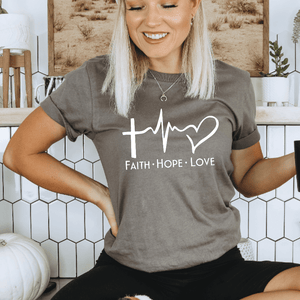 This trendy Faith Hope Love T-shirt is where faith meets fashion! This Faith tee is sleek, stylish, and versatile for any style.  Pair it with jeans and a jacket for a classy style or keep it casual and combine it with your favorite flannel shacket for a cute, comfy fall fashion. It's soft, comfy, and flattering for all.