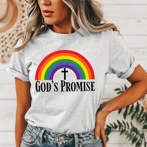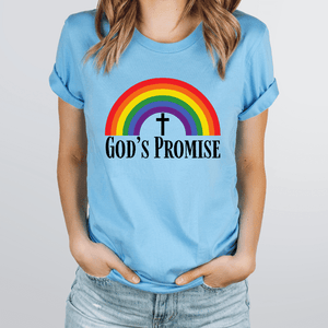This God's Promise Rainbow Shirt makes a bold faith statement!  It's the perfect reminder that the rainbow is a symbol of God's covenant between Him and the earth as written in Genesis 9:13-17.