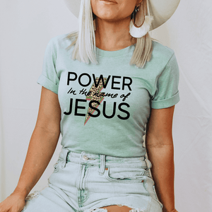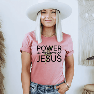 This Power In Jesus T-shirt will have you feeling strong and confident!  With a bold faith-based message and aesthetic design, this Power in the Name of Jesus tee is sure to turn heads.  It's soft, stylish, and flattering for all.  Pair it with your favorite skirt or jacket for a sophisticated style or dress it with jeans or joggers for a casual Christian outfit.