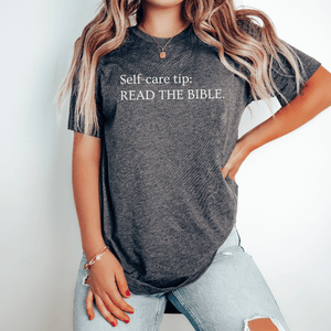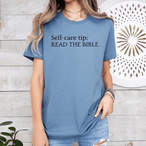 This Read The Bible T-shirt is the perfect choice to make a bold statement in faith and style! Discover a new way to share your faith in comfort and confidence without saying a word! This cool Christian t-shirt is versatile to create a variety of Christian fashion styles.  Plus, it shares a strong faith-based message, "Self-care tip: Read The Bible," It's a soft, lightweight Christian graphic tee that's a great reminder that the best self-care book ever written is the Bible.