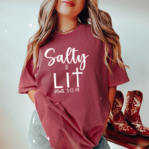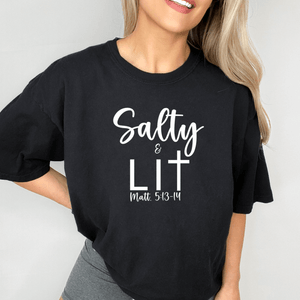 This Salty And Lit Shirt is the perfect Christian shirt to keep you looking smart and feeling confident to be the salt and light of the world!  Pair it with denim shorts for a fun summer beach outfit, or wear it with a trendy trouser and booties for a comfy chic outfit.  There's so many options to create your own style and share a faith-based message to anyone you meet.  It's a soft, relax fit vintage style Christian graphic tee that's sure to turn heads.