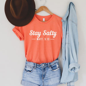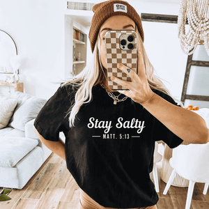 This Stay Salty t-shirt is the perfect combination of faith and fashion. It's a sleek, soft and stylish Christiangraphic tee that's versatile for a variety of styles.  Plus, it's great motivation to stay salty!  Wear it to the gym, or layer it with your favorite sweater or jacket for a chic fashion outfit.