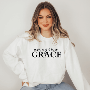 This cute Amazing Grace sweatshirt is sure to turn heads! It's versatile to create a variety of fashion outfits for any season.  Pair it with denim shorts or capri's for a cute spring style, or go for a comfy casual outfit with jogger pants and sneakers.  However you choose to wear it, you're sure to feel comforted and warm inside and out as it reminds your of the Amazing Grace of God's love for all who follow Him.