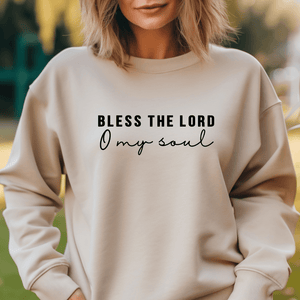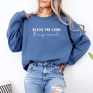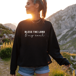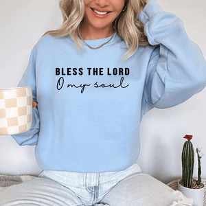 This Bless The Lord Sweatshirt is the perfect combination of comfort and faith.  Designed for the modern Christian woman who loves warmth, style and sharing her faith, this coze Christian sweatshirt is your perfect companion for chilly evenings and cooler temps.  Plus, it's a stylish way to share your faith with encouraging faith-based messages.  Inspired from Bible verses in Psalm 103, this Bless The Lord O my soul sweatshirt will keep you cozy, warm and feeling blessed! It's soft fabric and aesthetic Christian design creates comfort inside and out.  It's the perfect choice for gift-giving or treating yourself. Ideal for anyone who loves to make a statement in faith and fashion.
