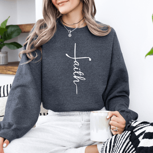 This Faith Cross Sweatshirt is a soft, stylish way to share your faith in Jesus.   Make a statement in faith & let your wardrobe reflect your heart for Jesus. With a simple design and symbol of the cross, this cute Christian sweatshirt can serve as a cozy reminder to you and anyone you meet as to who Jesus is - "in whom we have boldness and access with confidence through faith in Him." Eph. 3:12.  Curl up in comfort and confidence in the faith in Jesus Christ.