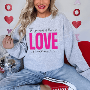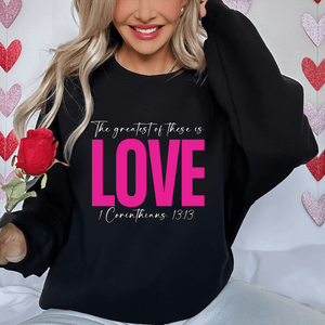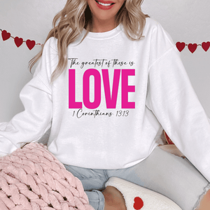 The Greatest Of These Is Love Sweatshirt is with 1 Corinthians 13:13 Bible verse is the perfect Christian women's sweatshirt to share God's word with anyone.  With an encouraging faith-based message and vibrant pink design, this Christian sweatshirt is one you'll love to wear. Plus it's soft, warm and versatile to create a variety of outfits for spring, summer and beyond.   Pair it with your favorite skinny jeans for a sporty chic style, or go for a comfy casual look with joggers and sneakers.