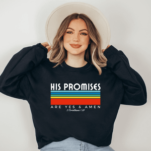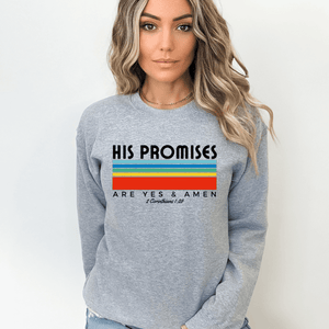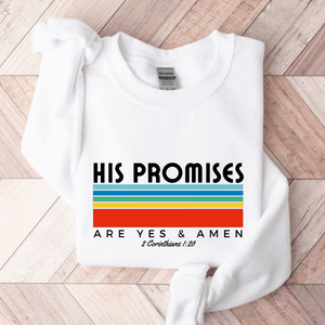 This His Promises Sweatshirt with Bible verse will add faith, fashion, and a flair of color to your wardrobe. This awesome Christian sweatshirt is soft, stylish, and sure to turn heads! Wearing cool Christian apparel with encouraging faith-based messages from Scripture is a fashion-forward way to share the gospel with others.
