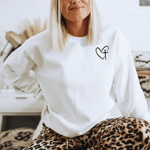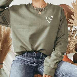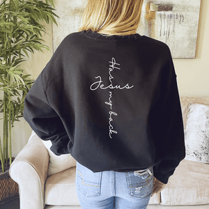 Jesus has my back sweatshirt. This Christian sweatshirt with designs on the front and back is sure to keep you warm on cool nights or all winter long! This Gildan sweatshirt is soft and warm and is a great way to wear your faith.  With a heart and cross design on the front and "Jesus has my back" written in a cross on the back, you can share your faith with anyone you meet.