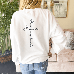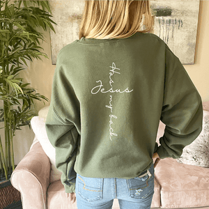 This cool Christian sweatshirt is a great reminder that He always has your back and is a strong testimonial to everyone you meet.  Christian sweatshirts with designs on the back are a fashion-forward way to express your faith everywhere you go. Wear this sweatshirt on a casual day with leggings or dress it up with your favorite Christian jewelry.  A simple faith necklace or bracelet will add just the right style to make a bold faith statement with a casual fashion outfit.