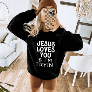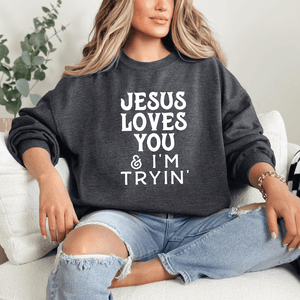 This Jesus Loves You and I'm Trying Sweatshirt is a funny Christian sweatshirt for women of all ages!  Because some days are harder than others to love like Jesus, at least you can share an encouraging faith-based message (or warning:) with anyone you meet!  This women's sweatshirt is the perfect combination of faith, fun, and fashion! Oh, and it's super cozy and warm.
