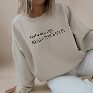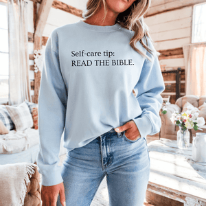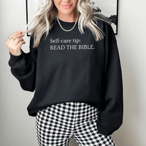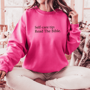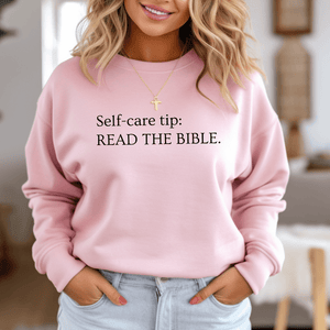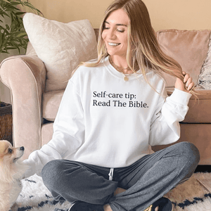This Read The Bible Sweatshirt is a must-have! With a bold faith-based message: Self-care tip: Read The Bible, it's bound to stand out in a crowd and create meaningful conversations.  It's a great reminder for yourself and others to read the Bible.  Plus, it's a trendy way to share your faith in Jesus without saying a word.