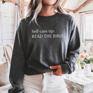This awesome Christian sweatshirt is more than just a soft, sleek sweatshirt, it's a subtle way to plant seeds of faith anywhere.  As Christ followers, we know the Bible is the best self-care book and tip anyone could have.  God's Word does not return void. - Isaiah 55:11.