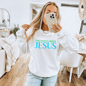 The World Needs Jesus Sweatshirt. This aesthetic Jesus sweatshirt is sure to stand out in a crowd! With vibrant colors and a bold message, this World Needs Jesus Sweatshirt is a must-have to your Christian clothing collection!  It's soft, warm, and stylish!  Plus it's super trendy! "For god did not send His Son into the world to condemn the world, but that the world through Him might be saved."  John 3:17.
