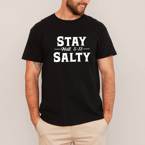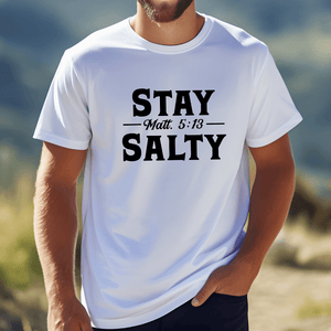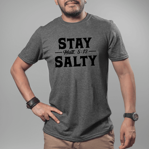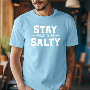This Stay Salty Mens T-shirt is sure to be your new favorite Christian t-shirt! With a bold faith-based message inspired with Matt. 5:13 Bible verse, it's sure to stand out in a crowd.  Whether you're looking for a great workout shirt, or an everyday casual outfit, this men's Christian t-shirt won't disappoint. Men's Christian t-shirts are a great gift for Father's Day, his birthday or Christmas.
