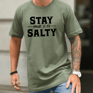Godly men who are proud to share their faith with others is a powerful impact the world needs.  This Stay Salty shirt serves as a great reminder for Believers to be the salt of the earth, which is often counter-culture to today's world.  Wearing your faith can plant seeds in others or start meaningful conversations that leads someone to the Lord.  This cool men's Christian t-shirt is lightweight, sturdy and a stylish way to wear your faith anywhere.  It sits nicely, maintains sharp lines around the edges, and goes perfectly with layered streetwear outfits. Plus, it's extra trendy!
