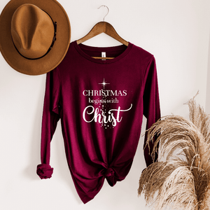 Enrich your wardrobe with this Christmas Begins with Christ Shirt.  This long-sleeve Christmas tee is soft, stylish, and best of all, shares a great reminder of the true reason for Christmas.    It's sure to be your go-to Christmas shirt for everything from Christmas shopping to baking cookies and more.  Pair it with jeans for a comfy casual Christian outfit, or layer it with a jacket for a classy winter fashion. It's versatile, soft, and flattering for a variety of styles and occasions!