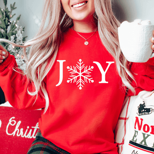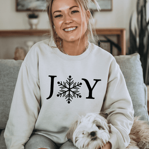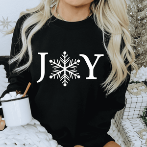 Joy Snowflake Sweatshirt is a must-have sweatshirt for colder temps and the joy of the Holiday season!  It's soft, warm, and stylish to wear all day at the shopping mall or curled up by the fire.  This Joy sweatshirt with a snowflake design is the perfect go-to sweatshirt for comfy casual winter outfits. It's versatile to be your favorite loungewear for a lazy day outfit curled up on the couch or for a classic casual outfit gearing up for the Holidays.  It's sure to keep you warm while spreading joy to others.