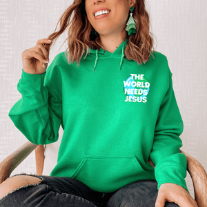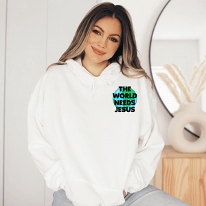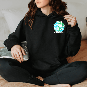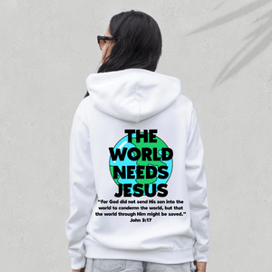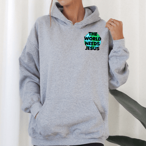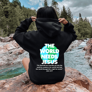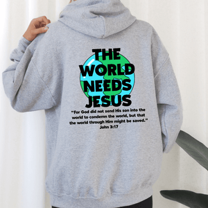 The World Needs Jesus Hoodie. What better way to share Jesus with the world than with this cool Christian sweatshirt? This World Needs Jesus hoodie has a vibrant design on the front and back with John 3:17 Bible verse.  It's sure to stand out in a crowd!  It's a comfy and warm way to wear your faith and spread the truth that The World Needs Jesus!