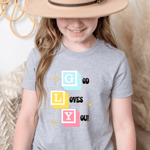 This God Loves You Kids Tee is kid tested and designed by my neice, Josie!  It's sure to be the one you've been looking for, and it's bound to become a favorite in any youngster's wardrobe.  With an encouraging faith-based message, this God Loves You kids shirt is a unique design that stands out from the crowd wherever you go! Christian kids clothes are a great way to let your kiddos express their faith and share Jesus with anyone they meet.  This cute God Loves You t-shirt is soft, comfortable and durable for all their favorite activities.