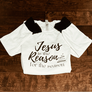 This Jesus Is The Reason Ruffle Sweatshirt is comfort, class and Christmas all wrapped in one!  Say hello to your favorite new ruffle sleeve Christmas sweatshirt! This limited edition Christmas sweatshirt is custom-made with a black pleated ruffle sleeve cuff and aesthetic Christmas design that shares "Jesus is the reason for the season".   It's a one-of-a-kind Christmas sweatshirt that's versatile for all your Holiday gatherings.  Dress it up with a trendy skirt or go for a casual chic style with jeans and booties.  However you choose to wear it, you're sure to stand out in a crowd.  Plus, it's a stylish way to remind everyone of the reason we celebrate Christmas - the birth of our Lord and Savior - Jesus!