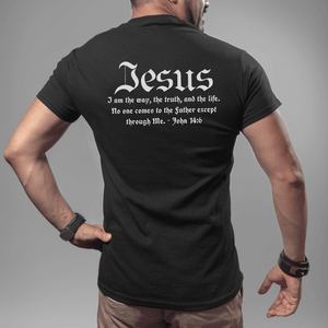 Jesus The Way Men's shirt with John 14:6 Bible verse on the back. If you are looking for cool Christian t-shirt for men, look no further.  This Jesus The WayMen's shirt is comfortable, sturdy, and stylish.  Now is the time to be bold in faith and share the hope and truth of Jesus.  There's nothing more manly than a man of God stepping up and speaking out to proudly proclaim Jesus.  Wearing your faith is such a great, relaxed way to share your faith. This Christian men's shirt is a perfect way to open a door to a conversation with an unbeliever or perhaps meet a new Brother.  It's comfortable and stylish. Plus, it's extra trendy now!  Looks great with jeans or layer with your favorite flannel on a chilly day.