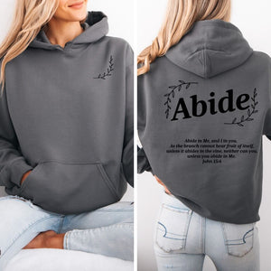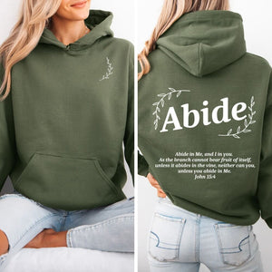 Our cozy Abide Hoodie is the ideal choice for a soft, smooth, and stylish way to share God's word anywhere. Featuring an aesthetic design with John 15:4 Bible verse on the back and vine graphic on the front, this Abide hoodie is a cozy reminder to Abide in Christ.