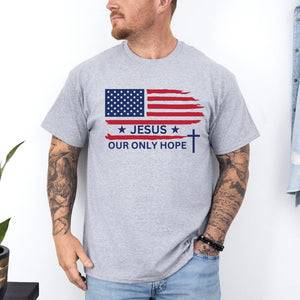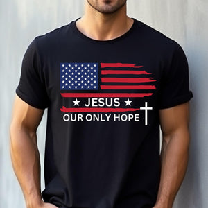 Jesus Our Only Hope Men's Shirt is the ultimate combination for showing off your faith and freedom values! With a bold, faith-based message and American flag design, this cool Christian shirt is sure to stand out in a crowd.  It's soft, sturdy, and stylish for everywhere from the gym to backyard barbecues.