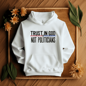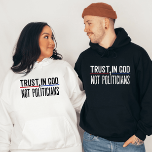 This Trust in God Hoodie is the patriotic hoodie every American needs.  With a bold, faith-based message, this cool, patriotic (unisex)  hoodie is sure to turn heads!  Patriotic hoodies are the perfect choice for cooler temps. This Trust In God Not Politicians hoodie for women or men makes a great gift for freedom-loving men and women of all ages. Everyone needs a cozy go-to statement hoodie to curl up in, so go for one that's soft, smooth, and stylish.  Wear it for a cool night camping, a day enjoying the great outdoors, or anything in between, this awesome Trust In God sweatshirt is a comfy, casual conversation starter!