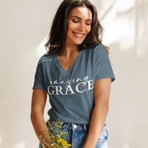 This Amazing Grace V-neck shirt is the ideal Christian tee for women. Its soft fabric and relaxed fit create a flattering style for an everyday look. With a faith-based design and v-neckline, it's a fashion-forward way to share your faith! Pair it with jeans or shorts for a casual outfit, or layer it with a trendy jacket for a chic, sophisticated style.