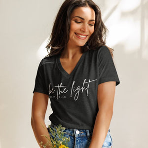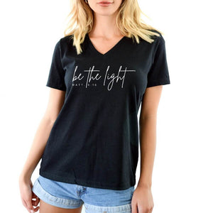 Be The Light V-neck T-shirt. Embrace ultimate comfort with this women’s V-neck Christian t-shirt.  With an encouraging faith-based message and sleek design, it's a stylish way to share your faith!   This women's V-neck t-shirt is a soft fabric and relaxed fit, creating a classic everyday look, with the V-neck adding a touch of style.