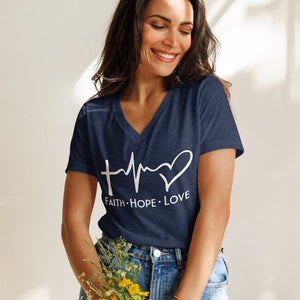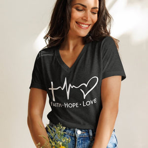 This Faith Hope Love V-neck shirt is a classic combination of faith and fashion. Three simple words create a powerful faith-based message inspired by 1 Corinthians 13:13 - Faith, Hope, Love.  This women's Christian V-neck tee is soft, stylish, and flattering for all. It's versatile to create a variety of modest Christian outfits, from an everyday laid-back look with jeans and sneakers to a chic, sophisticated style with your favorite jacket.