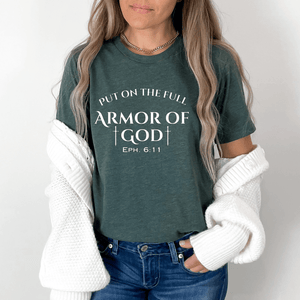 Put on the full Armor of God T-shirt and show off your faith in comfort and style!  Christian t-shirts with Bible verses are a fashion-forward way to intentionally show your love for the Lord.  With a bold faith message to put on the full armor of God and a flattering fit, this awesome Christian t-shirt is sure to get compliments everywhere you go. It's an aesthetic Christian design that can be styled to create a variety of Christian fashion looks.