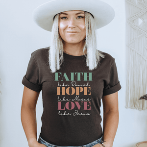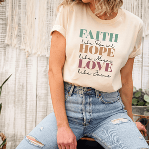 Faith Hope Love Like Jesus T-shirt. This Faith Hope Love shirt is a great faith statement shirt for any day. Can you think of any better example than Faith like Daniel in the lions' den, Hope like Moses in the wilderness, Love like Jesus giving His life for us?