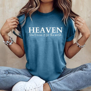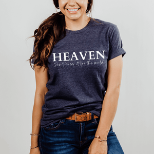 This Heaven T-shirt is a fashion-forward way to make a bold faith statement!  This cute Christian graphic tee is a stylish way to intentionally share a strong faith-based message.  It's soft and versatile to wear for many occasions.  Pair it with your favorite jeans or shorts for a laid-back look, or layer it with a trendy jacket for a sleek, sophisticated urban outfit.  It's soft, chic, and sure to stand out in a crowd.