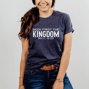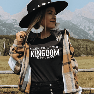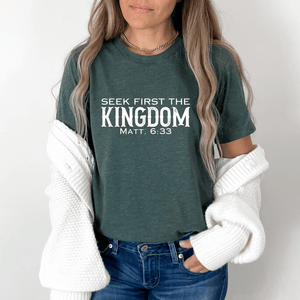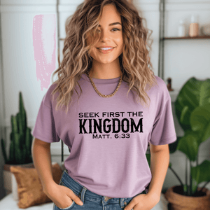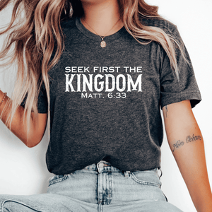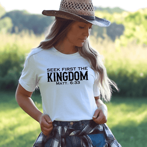 Prepare to turn heads with this Seek First The Kingdom t-shirt with Bible verse!  This cool Christian t-shirt with Bible verse is a stylish way to show your love for God. It's versatile to create a variety of Christian outfits.  Pair it with denim shorts or capris for a casual summer style, layer it with a denim or flannel jacket for a trendy fall outfit, or keep it simple with joggers for a classic Christian streetwear style.